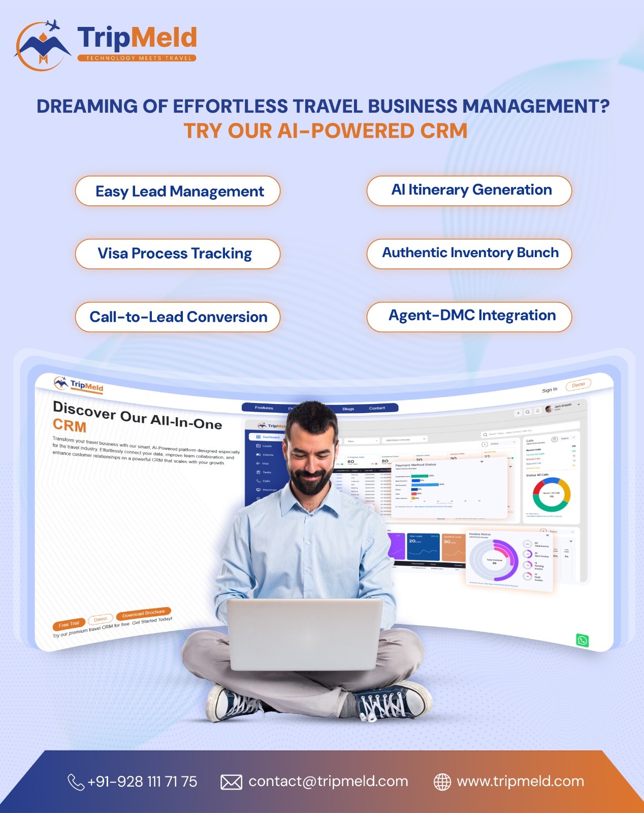 Still following up leads manually? TripMeld’s on-call lead generation tool ensures you never miss a hot lead. Say hello to better conversions and faster bookings! Reach out to us for more details 📞 +91 9281117175 Visit our website 🌐www.tripmeld.com #SmartTravelSolutions #TripMeld #TravelCRM #LeadGeneration #TravelAgentsLife #DMCIntegration #VisaTracking #AIAutomation #TravelTech #TravelBusiness #SalesForTravelAgents #CloseDealsFaster #TravelSoftware #QuoteGenerator #CRMForTravel #BestTravelCRM